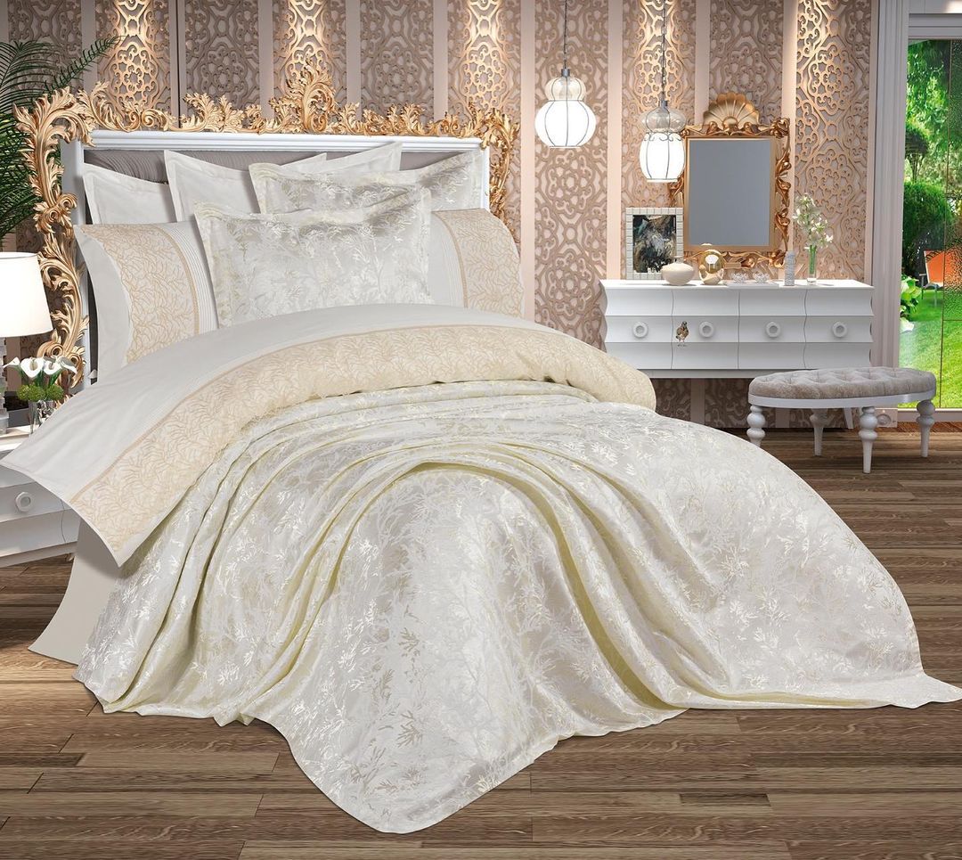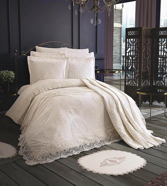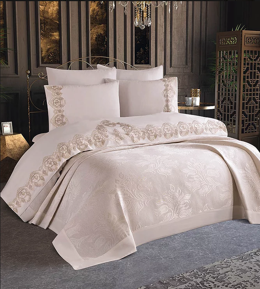 Set Cuvertură Pique de Lux Satinata cu broderie elegantă, 6 piese, pat 2 persoane, CPL04